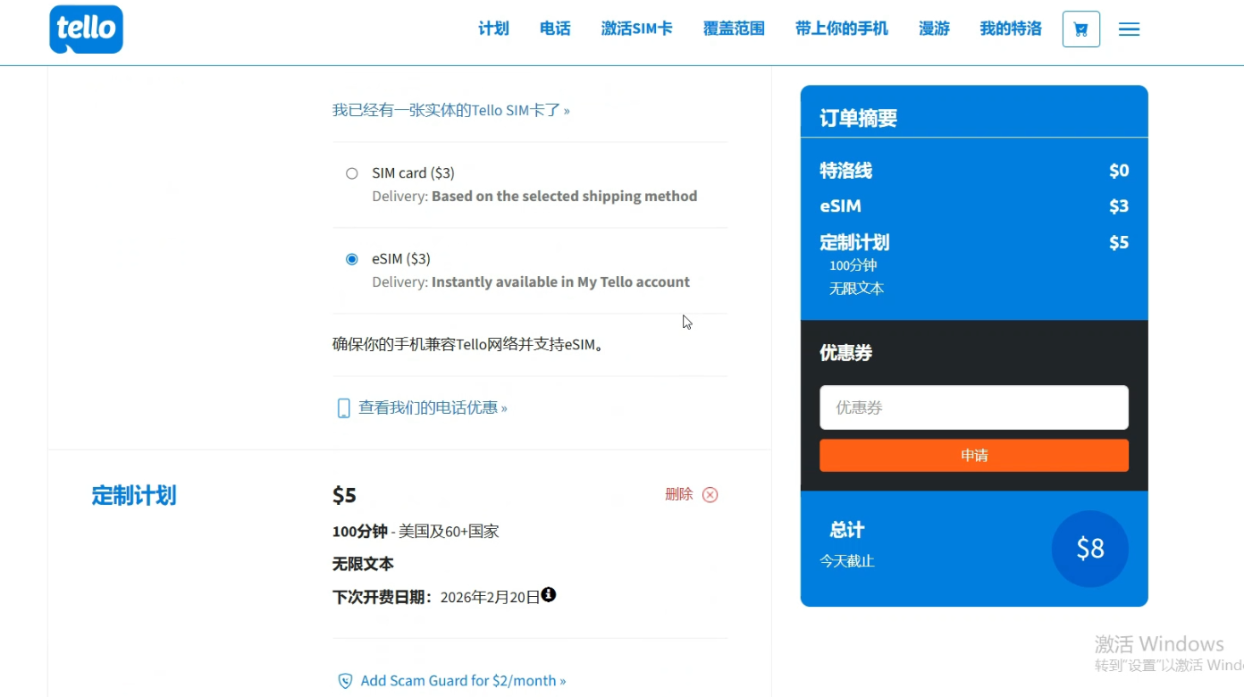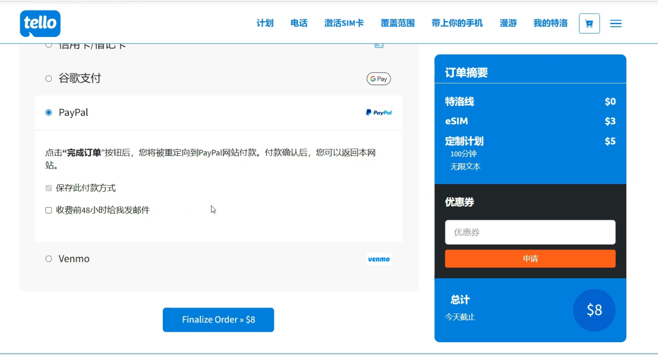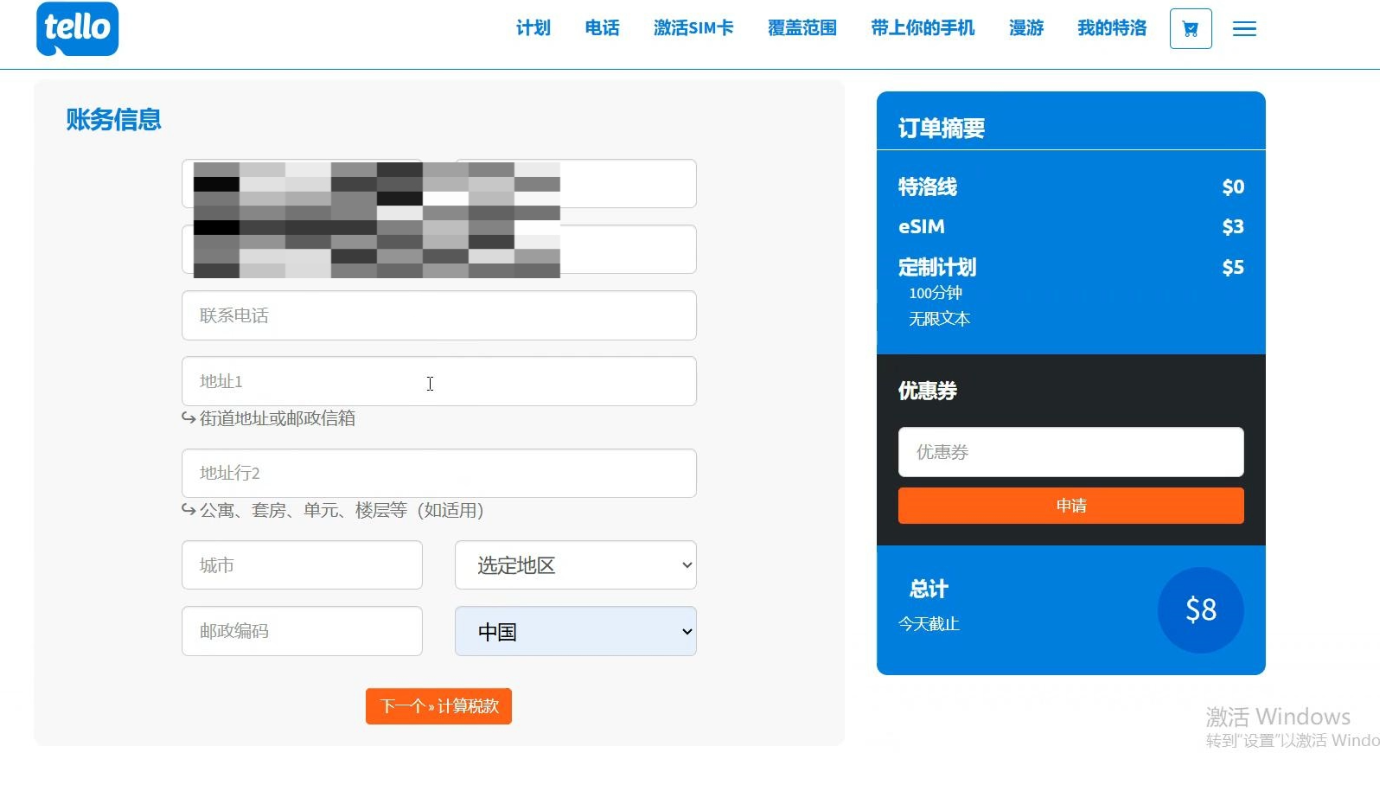在 Tello 官网 购买 Tello eSIM 大概的流程如下: