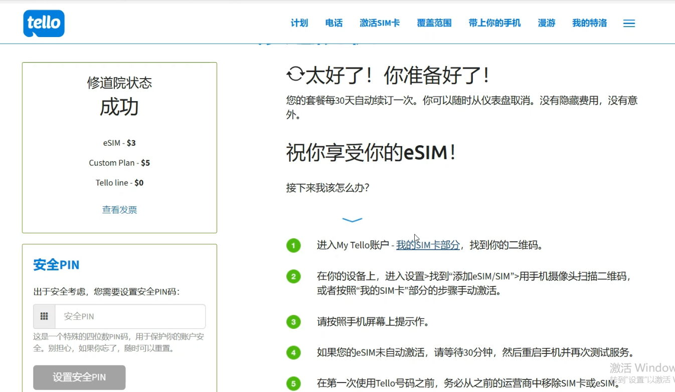 还需要设置「Security PIN」,当你激活失败时才能重新免费换领 eSIM 二维码,因为 Tello 的 eSIM 二维码只能使用一次,无论激活成功或失败,都无法再次扫码该码激活。设置「Security PIN」流程为:登录 官网 ➡️ 点击「My Settings」➡️ 「One-time Mobile App Password」设定 Security PIN。