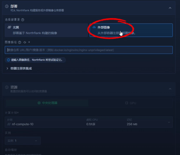 - 部署方式: 选择第三项 Deployment from External Image(从外部 Docker 镜像部署)。