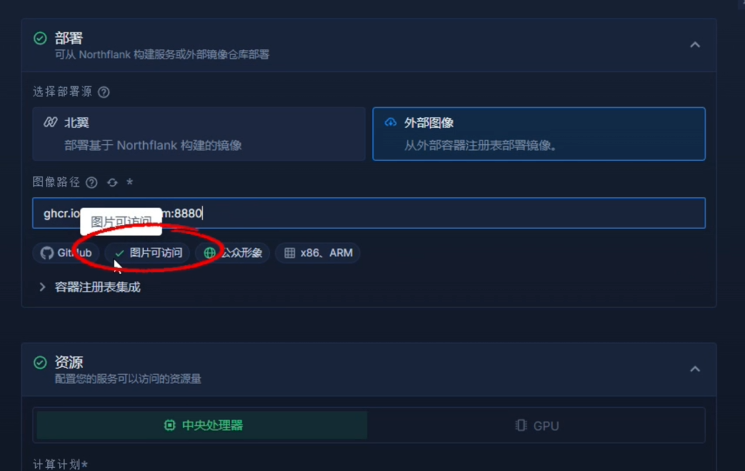 - 镜像地址: 粘贴你的 Docker 镜像路径,看到绿色对勾代表验证成功。