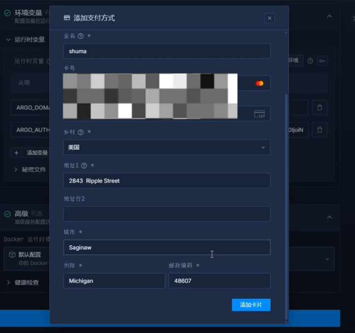 - 验证流程: 此时会弹出绑卡页面。输入卡号、有效期及 CVV(可使用美国地址生成器填写地址)。